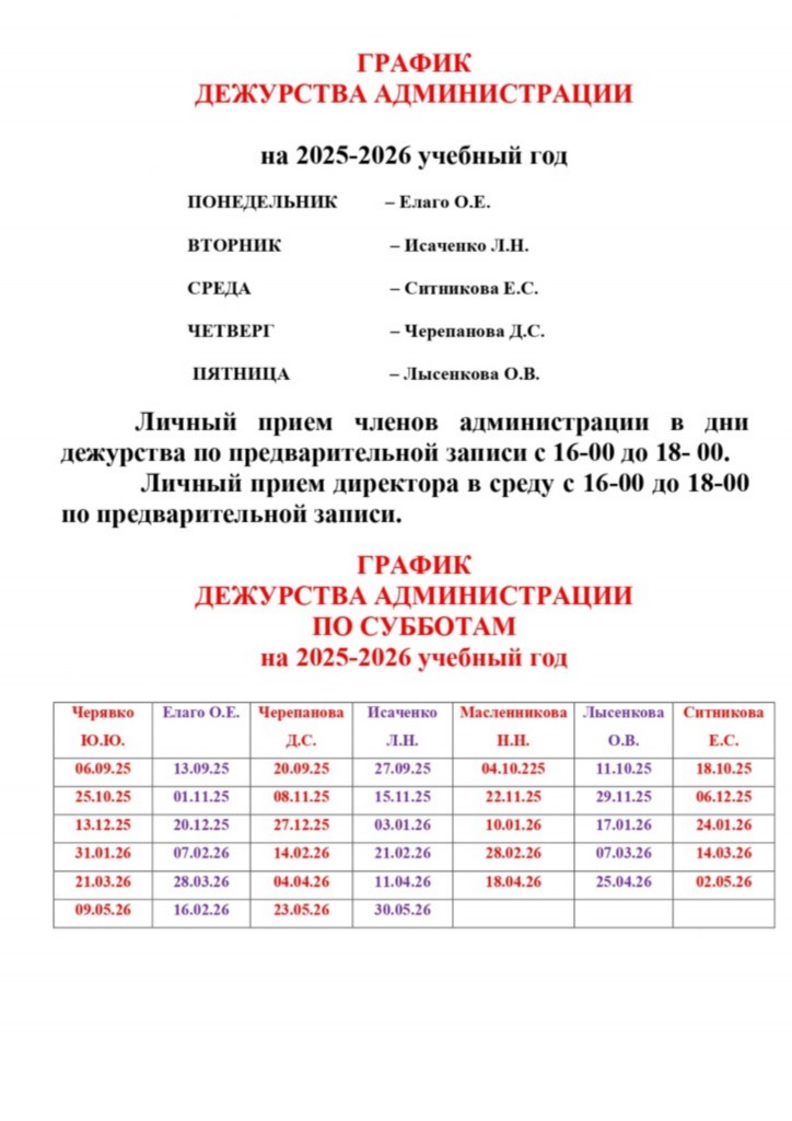 График приема директора и других членов администрации |